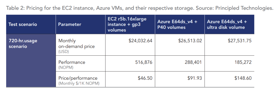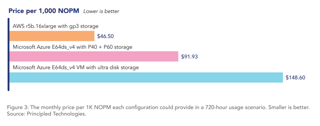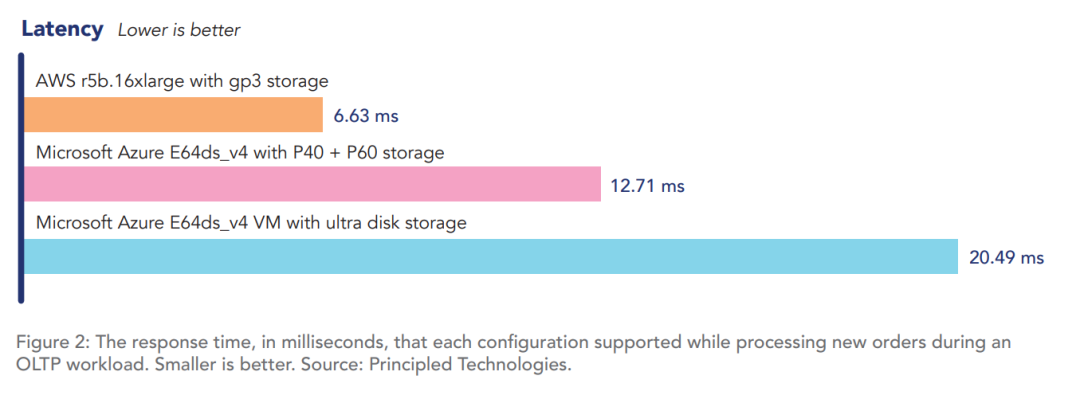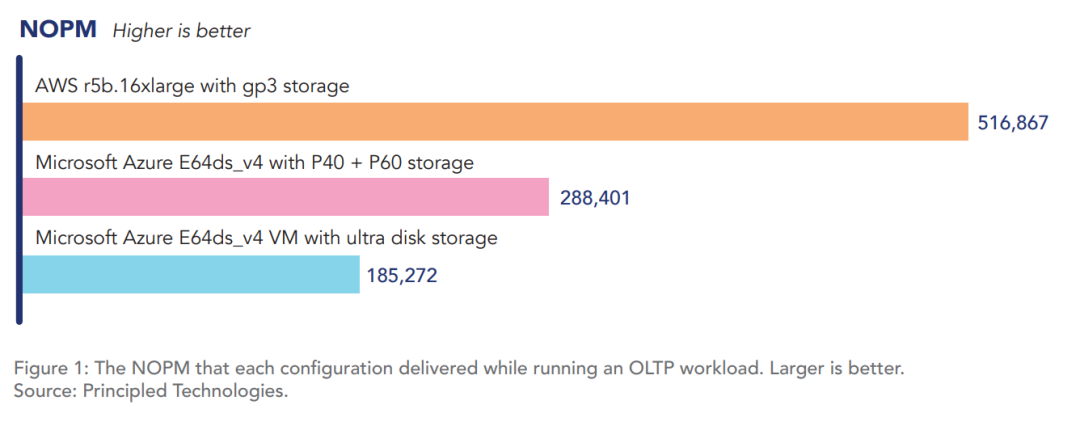 Principled Technologies的报告喜欢用NOPM这个单位,说的是new orders per minute,每分钟的订单数,在测试中,AWS r5b.16xlarge的NOPM是E64ds_v4加Premium SSD(上图中的P40+P60)的1.7倍,是E64ds_v4加Ultra Disk的2.7倍。