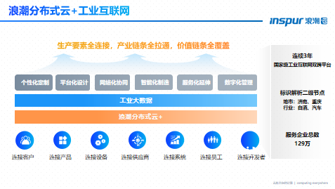 基于“分布式云+”,以工业大数据为核心,帮助企业实现客户、产品、设备、供应商、系统、员工以及开发者等七大要素的闭环连接,同时把多模态数据的采集、开发、分析、决策融合贯通,完整覆盖个性化定制、平台化设计、网络化协同和智能化制造,以及服务化延伸和数字化管理。截至目前,浪潮已连续3年评为国家级工业互联网双跨平台,建立了区域和行业的标识解析二级节点,服务企业数达到129万家。