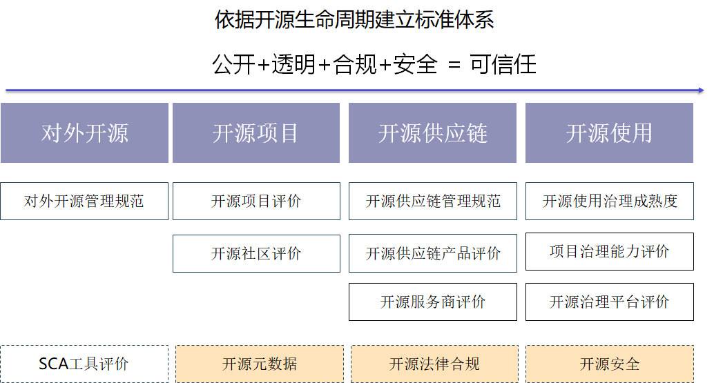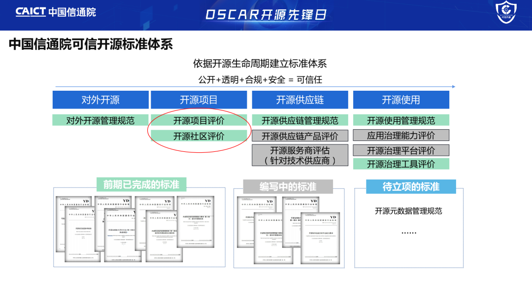 中国信通院可信开源标准体系是指依据开源生命周期建立的一套开源标准体系,分别从对外开源、开源项目、开源供应链和开源使用四个阶段制定标准,公开透明合规安全可被信任。其中,可信开源项目系列标准包括《可信开源项目评价标准》和《可信开源社区评价标准》。