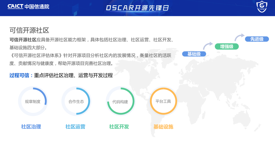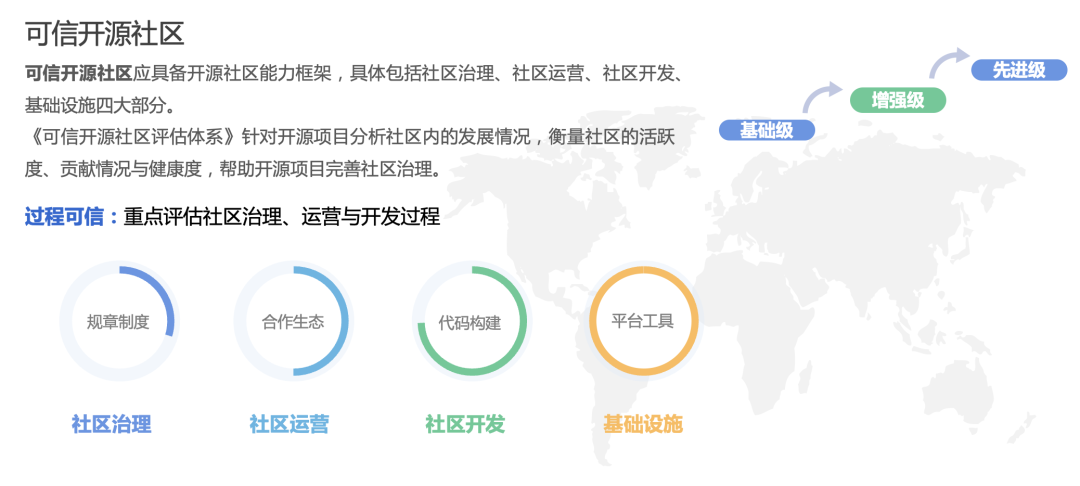 本标准将开源社区的成熟度分为基础级、增强级、先进级三个等级,在即将启动的新一轮可信开源项目社区评估中将采用最新标准对开源项目与开源社区进行能力评估。