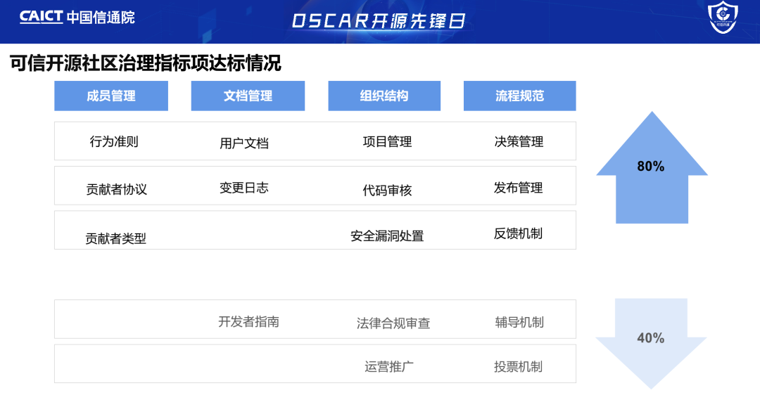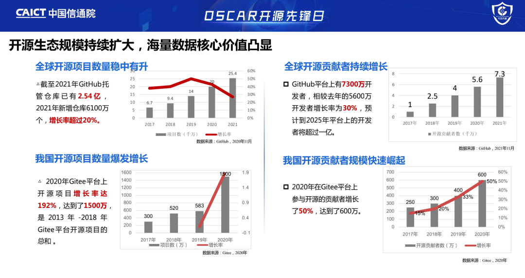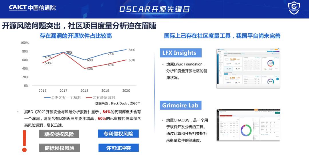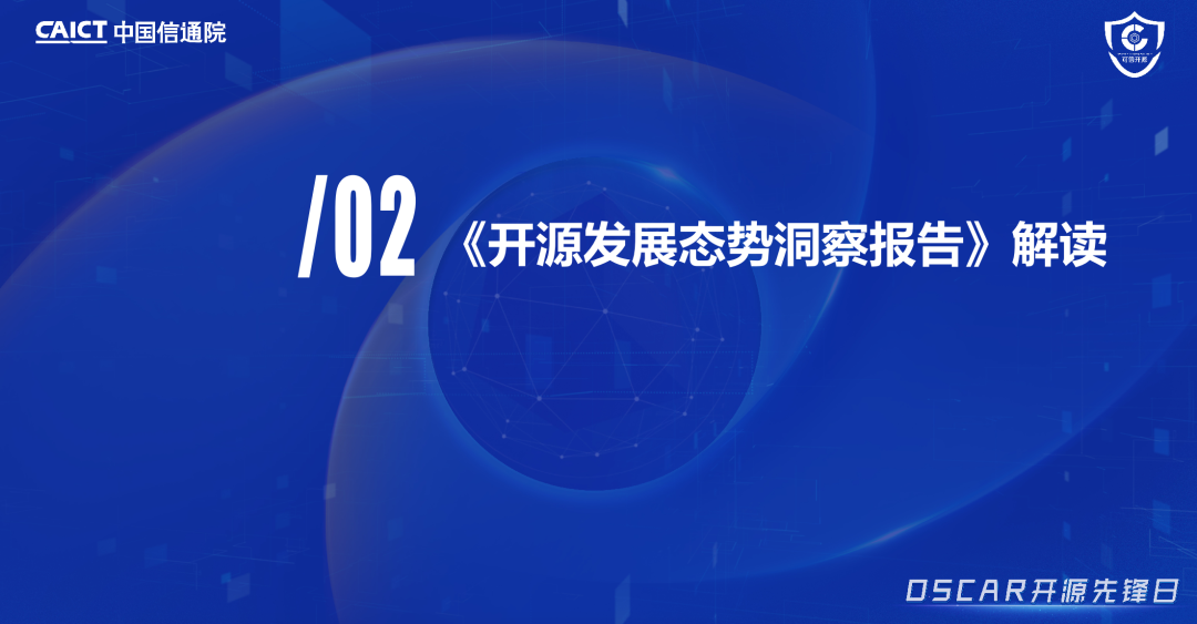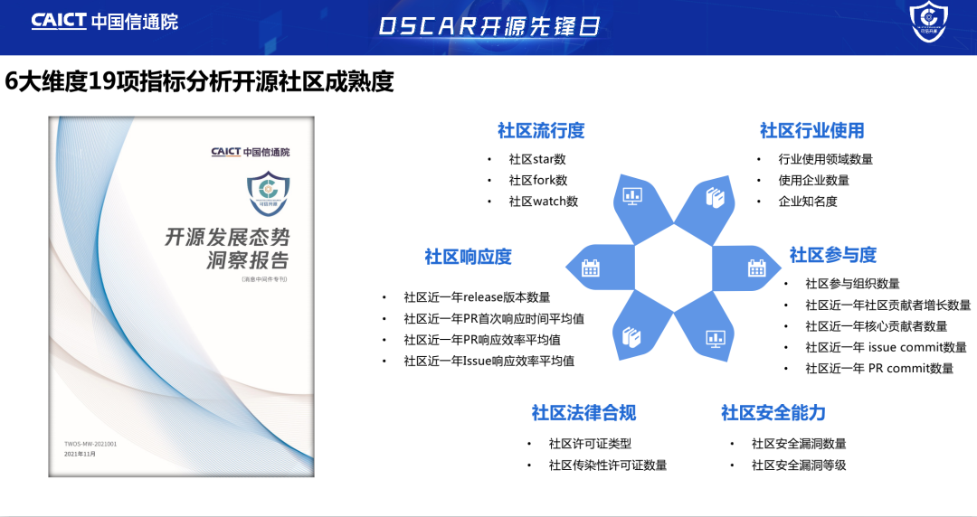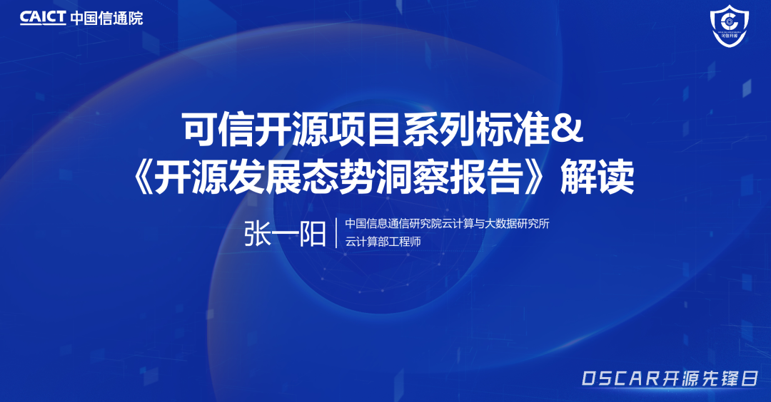 2022年1月5日,由中国信息通信研究院(以下简称“中国信通院”)主办,云计算开源产业联盟承办,云计算标准与开源推进委员会与金融行业开源技术应用社区支持的2022 OSCAR开源先锋日&金融行业开源技术应用社区闭门会议在北京顺利举办,中国信息通信研究院云计算与大数据研究所云计算工程师张一阳就可信开源项目系列标准和《开源发展态势洞察报告》进行了详细解读。
