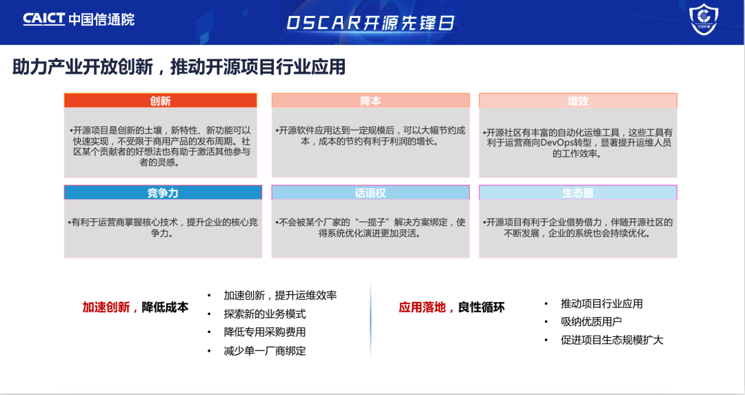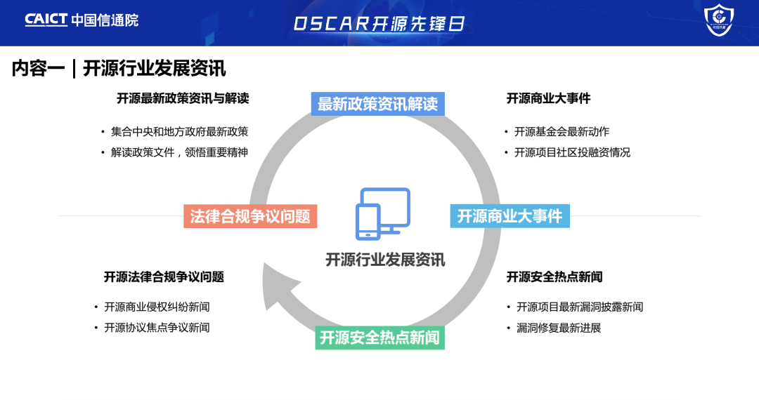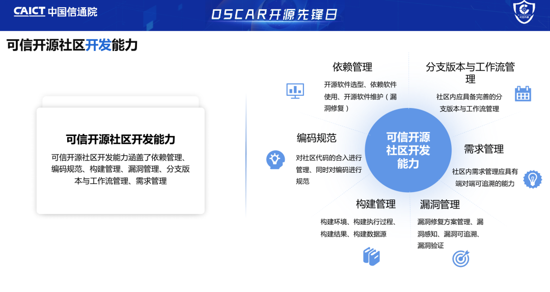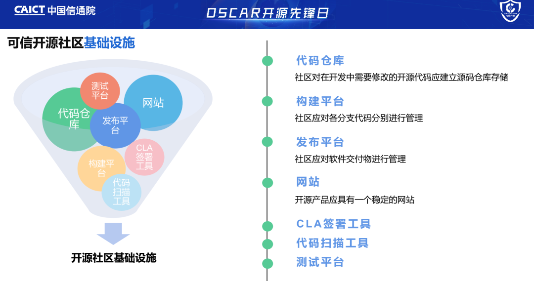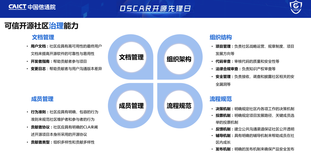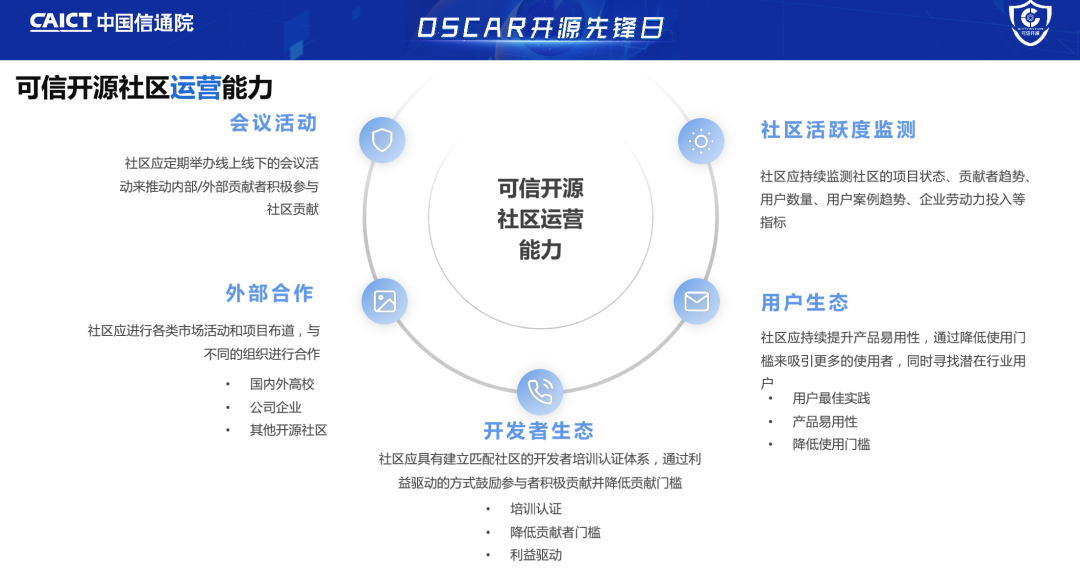 2022年1月5日,由中国信息通信研究院(以下简称“中国信通院”)主办,云计算开源产业联盟承办,云计算标准与开源推进委员会与金融行业开源技术应用社区支持的2022 OSCAR开源先锋日&金融行业开源技术应用社区闭门会议在北京顺利举办,中国信息通信研究院云计算与大数据研究所云计算工程师张一阳就可信开源项目系列标准和《开源发展态势洞察报告》进行了详细解读。