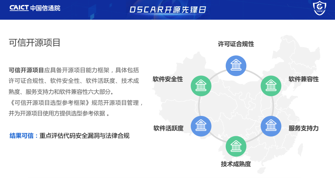 可信开源项目评价标准的评估对象为开源项目,从结果维度出发,重点评估开源项目的代码漏洞安全与法律合规,规范了开源项目管理,为开源项目使用方提供了选型参考依据。可信开源项目评价从许可证合规性、软件安全性、软件活跃度、技术成熟度、服务支持力和软件兼容性六大方面考察了开源项目的管理能力。
