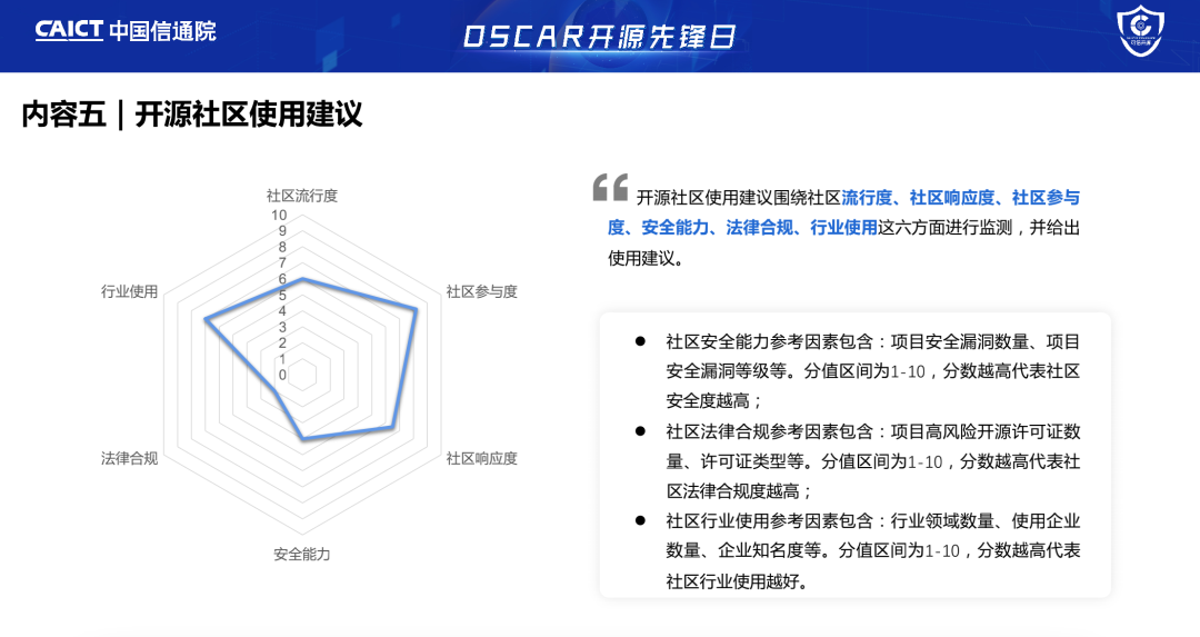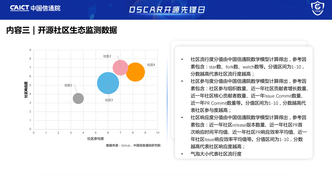 本次大会上还首次对外公布了前期由中国信通院编写并发布的《开源发展态势洞察报告—开源消息中间件专刊》。《开源发展态势洞察报告》旨在通过提炼《可信开源社区评估规范 第1部分:总体框架》标准中的核心指标,定义开源社区的相关评价指标和构建开源社区健康的衡量标准,提高开源社区的透明度和可操作性,方便金融机构、运营商等利益相关者就开源项目选择做出更明智的决策,同时让开源项目能够良性发展且具有可持续性。