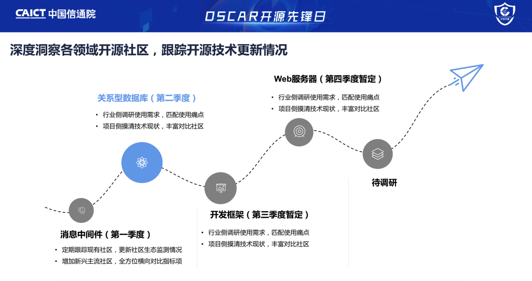 报告包含开源行业发展资讯、开源社区基本信息、开源社区生态监测数据、开源社区安全合规和行业使用情况、开源社区使用建议五部分内容,会上对五部分内容进行了详细解读,同时公布了后续报告的发布计划。《开源发展态势洞察报告—开源分布式数据库专刊》将于2022年2月下旬进行发布,如对本刊报告有意向咨询的欢迎联系,具体安排如下:
