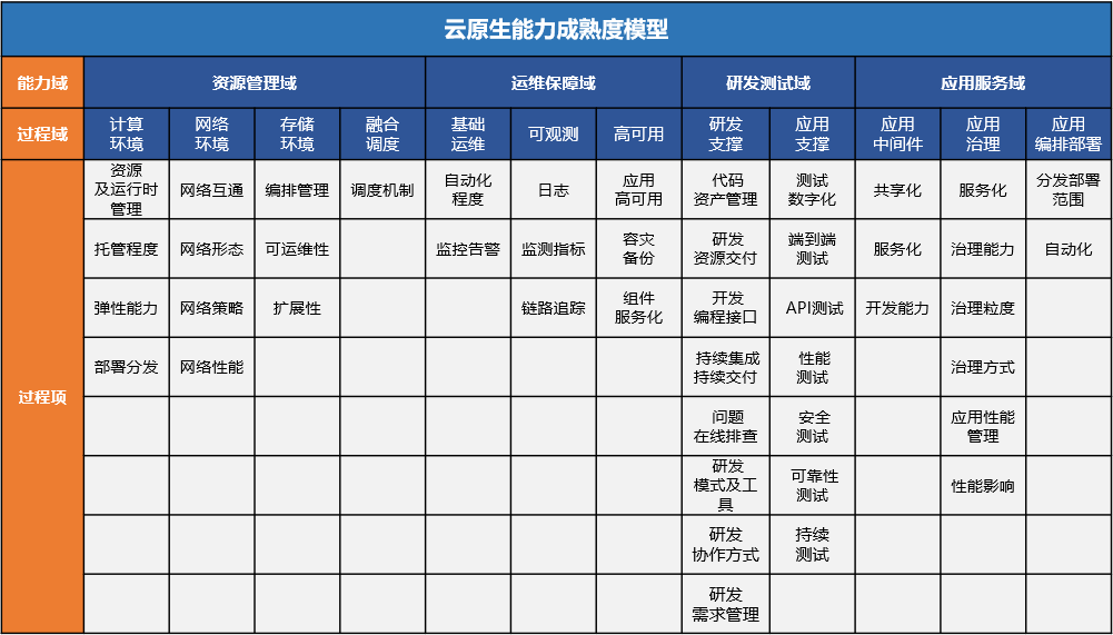 评估面向基于云原生技术建设的平台架构,用于帮助用户快速对照、定位技术架构能力水平,并根据自身业务需求结合模型高阶能力定制技术架构演进方向。评估涵盖资源管理、运维保障、研发测试、应用服务4个能力域,12个过程域,46个能力子项,476个细分能力要求,从弹性、高可用、自愈性、可观测性以及自动化五个维度反应技术架构的云原生特性。