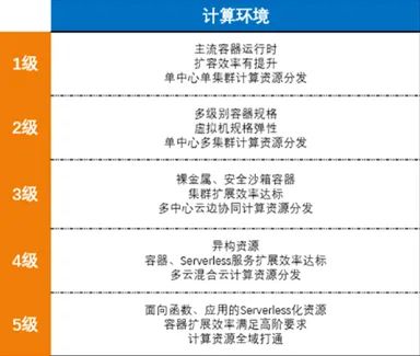 计算环境是云原生技术架构中的算力支撑单元,评估主要检验计算资源的提供方式、抽象程度、供给弹性水平、分发范围等。