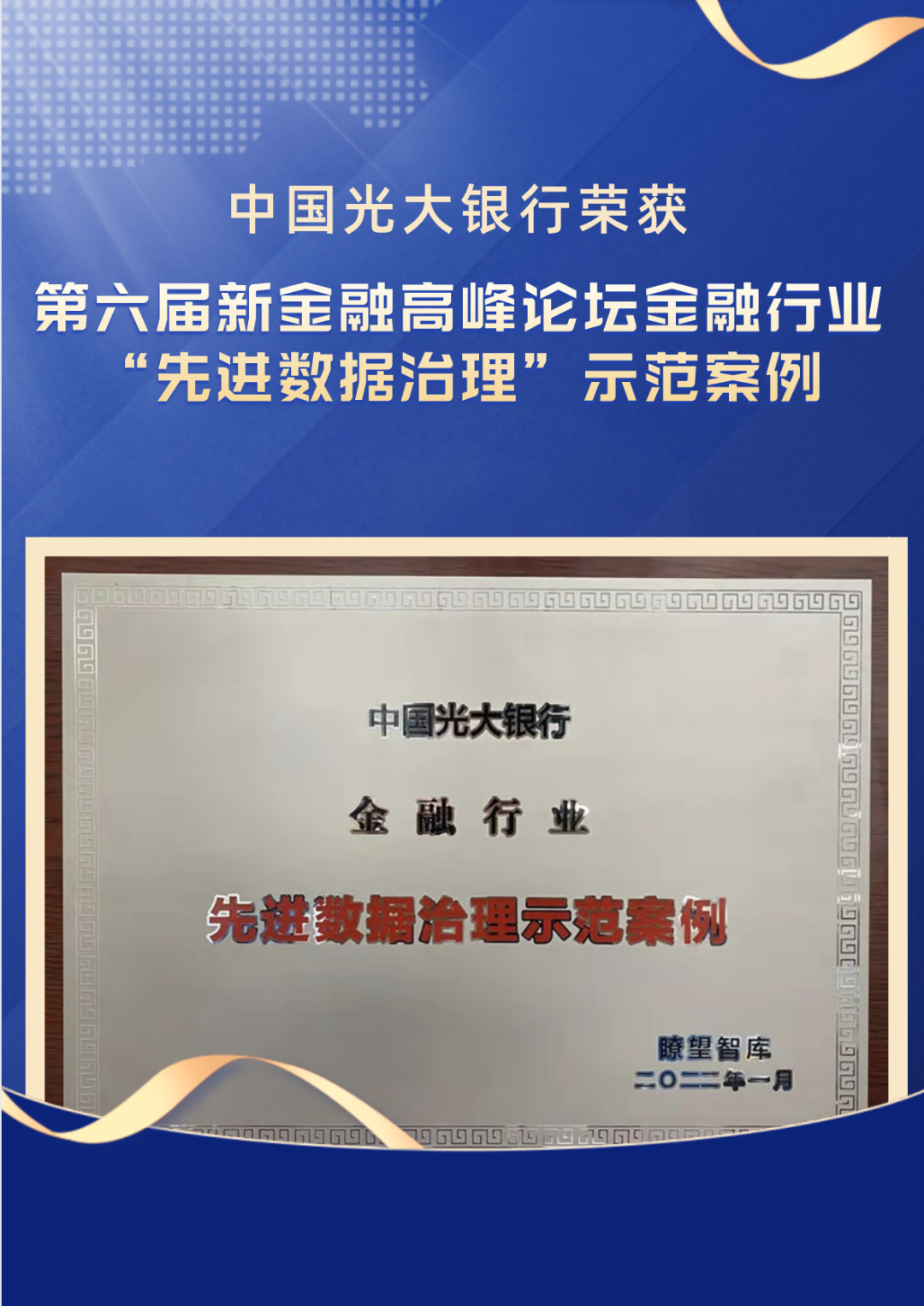 2022年1月9日,由新华社瞭望智库主办的第六届新金融高峰论坛之“十四五”开局金融行业系列示范案例评选结果出炉,中国光大银行荣获金融行业“先进数据治理”示范案例。