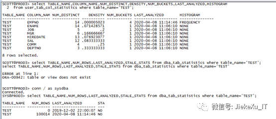注意:普通用户查 user_tab_col_statistics ,DBA 用户可以查 dba_tab_col_statistics。当然也可以使用 dba_tab_statistics 查看最近一次统计信息收集时间。