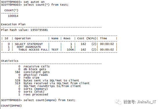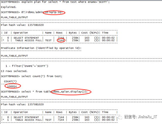 explain plan for select * from test whereename='SCOTT';@?/rdbms/admin/utlxplp.sqlSelect count(*) from test;select * from table(dbms_xplan.display());