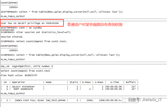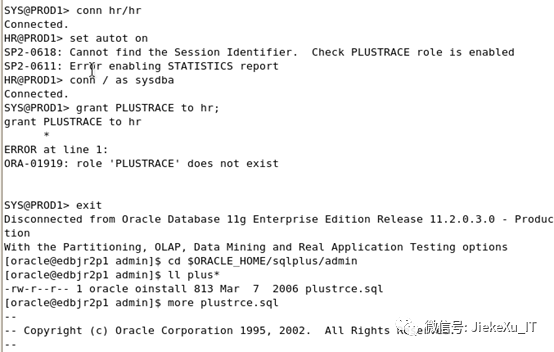 这里值得说明的是当普通用户使用此命令查看执行计划时则会报错,原因是系统缺少角色 PLUSTRACE.需要执行脚本 plustrce.sql 脚本,执行完脚本后将此角色授予给普通用户则可以查看。