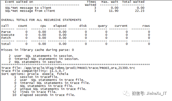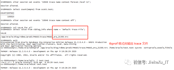 Alter session set events ‘10046 trace namecontext forever,level 12’;Select count(empno) from scott.test;Alter session set events ‘10046 trace namecontext off’;Select value from v$diag_info where name=’Default Trace File’;Tkprof XXXX/21300.trc test.text sys=nosort=prsela,exeela,fchela