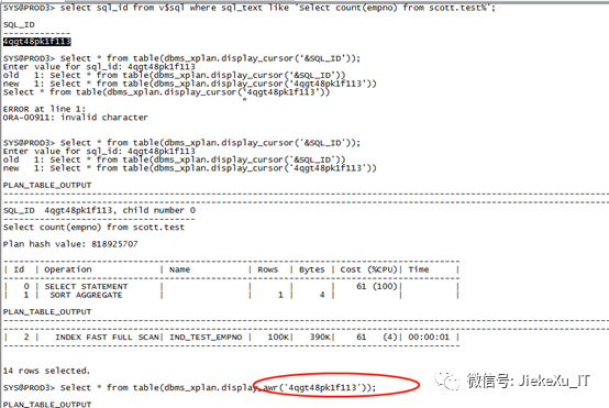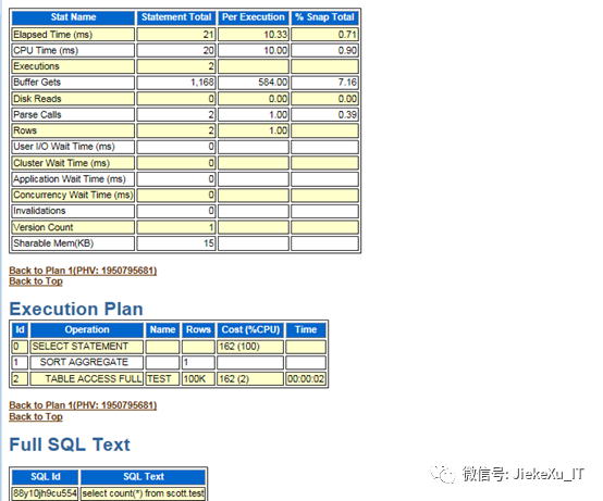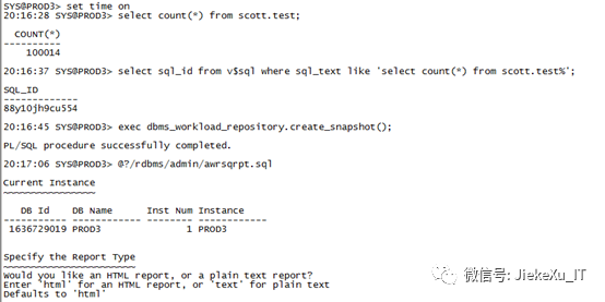 --示范例SYS@PROD3> set time on20:23:23 SYS@PROD3> select count(*) from scott.test;COUNT(*)----------10001420:23:35 SYS@PROD3> select count(*) from scott.test;COUNT(*)----------10001420:23:36 SYS@PROD3> select sql_id from v$sql where sql_text like 'select count(*) from scott.test%';SQL_ID-------------88y10jh9cu55420:23:47 SYS@PROD3> exec dbms_workload_repository.create_snapshot();PL/SQL procedure successfully completed.20:24:31 SYS@PROD3> @?/rdbms/admin/awrsqrpt.sqlCurrent Instance~~~~~~~~~~~~~~~~DB Id DB Name Inst Num Instance----------- ------------ -------- ------------1636729019 PROD3 1 PROD3Specify the Report Type~~~~~~~~~~~~~~~~~~~~~~~Would you like an HTML report, or a plain text report?Enter 'html' for an HTML report, or 'text' for plain textDefaults to 'html'Enter value for report_type:Type Specified: htmlInstances in this Workload Repository schema~~~~~~~~~~~~~~~~~~~~~~~~~~~~~~~~~~~~~~~~~~~~DB Id Inst Num DB Name Instance Host------------ -------- ------------ ------------ ------------* 1636729019 1 PROD3 PROD3 cs-0000zzskpr2Using 1636729019 for database IdUsing 1 for instance numberSpecify the number of days of snapshots to choose from~~~~~~~~~~~~~~~~~~~~~~~~~~~~~~~~~~~~~~~~~~~~~~~~~~~~~~Entering the number of days (n) will result in the most recent(n) days of snapshots being listed. Pressing <return> withoutspecifying a number lists all completed snapshots.Enter value for num_days: 1Listing the last day's Completed SnapshotsSnapInstance DB Name Snap Id Snap Started Level------------ ------------ --------- ------------------ -----PROD3 PROD3 3783 09 Apr 2020 00:01 13784 09 Apr 2020 02:00 13785 09 Apr 2020 03:00 13786 09 Apr 2020 04:01 13787 09 Apr 2020 05:00 13788 09 Apr 2020 06:00 13789 09 Apr 2020 07:00 13790 09 Apr 2020 08:00 13791 09 Apr 2020 09:00 13792 09 Apr 2020 10:00 13793 09 Apr 2020 11:00 13794 09 Apr 2020 12:00 13795 09 Apr 2020 13:00 13796 09 Apr 2020 14:00 13797 09 Apr 2020 15:00 13798 09 Apr 2020 16:00 13799 09 Apr 2020 17:00 13800 09 Apr 2020 18:00 13801 09 Apr 2020 19:00 13802 09 Apr 2020 20:00 13803 09 Apr 2020 20:17 13804 09 Apr 2020 20:24 1Specify the Begin and End Snapshot Ids~~~~~~~~~~~~~~~~~~~~~~~~~~~~~~~~~~~~~~Enter value for begin_snap: 3803Begin Snapshot Id specified: 3803Enter value for end_snap: 3804End Snapshot Id specified: 3804Specify the SQL Id~~~~~~~~~~~~~~~~~~Enter value for sql_id: 88y10jh9cu554SQL ID specified: 88y10jh9cu554Specify the Report Name~~~~~~~~~~~~~~~~~~~~~~~The default report file name is awrsqlrpt_1_3803_3804.html. To use this name,press <return> to continue, otherwise enter an alternative.Enter value for report_name: awrsqlrpt_1_3803_3804.html……………………<br ><a class="awr" href="#top">Back to Top</a><p ></body></html>Report written to awrsqlrpt_1_3803_3804.html