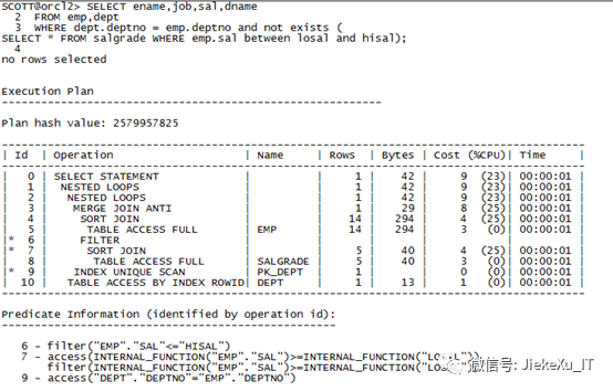SELECT ename,job,sal,dnameFROM emp,deptWHERE dept.deptno = emp.deptno and notexists (SELECT * FROM salgradeWHERE emp.sal between losal and hisal);