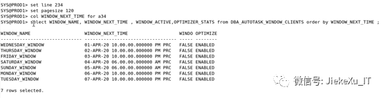 SYS@PROD1> set line 234SYS@PROD1> set pagesize 120SYS@PROD1> col WINDOW_NEXT_TIME fora34SYS@PROD1> select WINDOW_NAME,WINDOW_NEXT_TIME , WINDOW_ACTIVE,OPTIMIZER_STATS from DBA_AUTOTASK_WINDOW_CLIENTS order by WINDOW_NEXT_TIME ;WINDOW_NAME WINDOW_NEXT_TIME WINDO OPTIMIZE---------------------------------------------------------------- ----- --------WEDNESDAY_WINDOW 01-APR-20 10.00.00.000000 PMPRC FALSE ENABLEDTHURSDAY_WINDOW 02-APR-20 10.00.00.000000 PMPRC FALSE ENABLEDFRIDAY_WINDOW 03-APR-20 10.00.00.000000 PMPRC FALSE ENABLEDSATURDAY_WINDOW 04-APR-20 06.00.00.000000 AMPRC FALSE ENABLEDSUNDAY_WINDOW 05-APR-20 06.00.00.000000 AMPRC FALSE ENABLEDMONDAY_WINDOW 06-APR-20 10.00.00.000000 PMPRC FALSE ENABLEDTUESDAY_WINDOW 07-APR-20 10.00.00.000000 PMPRC FALSE ENABLED7 rows selected.