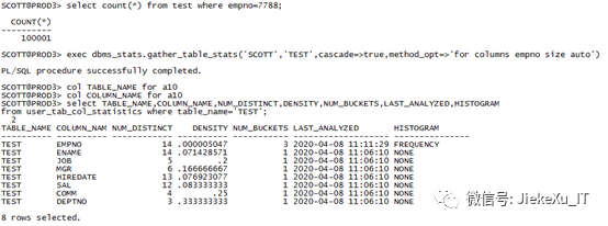 col TABLE_NAME for a10col COLUMN_NAME for a10select TABLE_NAME,COLUMN_NAME,NUM_DISTINCT,DENSITY,NUM_BUCKETS,LAST_ANALYZED,HISTOGRAM from user_tab_col_statisticswhere table_name='TEST';