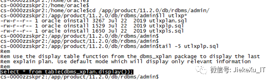 Explainplan for:这个命令后面直接跟 SQL语句,然后运行家目录下的 utlxplp.sql 这个脚本便可以查看执行计划。那么这个脚本是啥内容,如下也就是一行内容,这样便可以直接使用如下语句了。顺便说一句,前面客户端工具也是调用这个脚本产生执行计划,那么,这个方法查看的执行计划当然也不是真实的了。