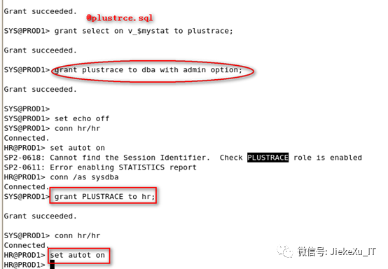 set echo ondrop role plustrace;create role plustrace;grant select on v_$sesstat to plustrace;grant select on v_$statname to plustrace;grant select on v_$mystat to plustrace;grant plustrace to dba with admin option;set echo off