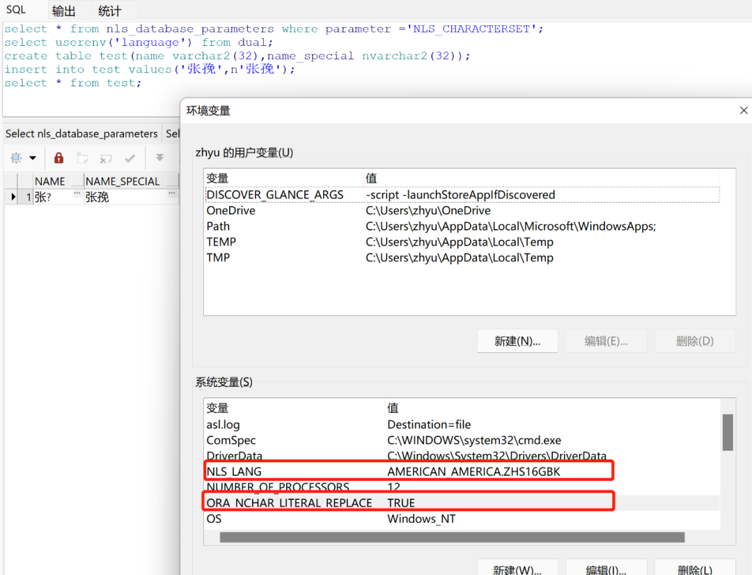 ZHYU@ora11> create table test(name varchar2(32),name_special nvarchar2(32));Table created.ZHYU@ora11> insert into test values('䶮䫻',n'䶮䫻');1 row created.ZHYU@ora11> select * from test;NAME NAME_SPECIAL-------------------------------- --------------------------------?????? ??????