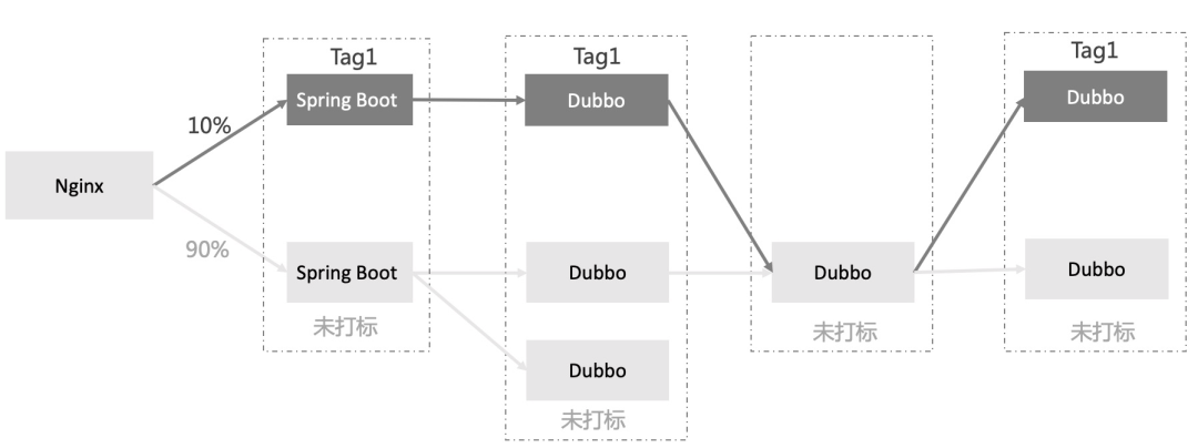 有 tag 的调用链路上找不到相同 tag 的节点,则 fallback 到无 tag 的节点