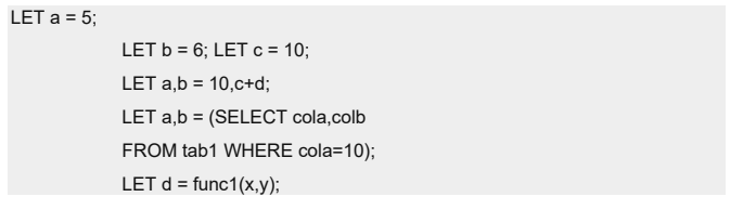 以 LET 语句,您可以等号(=)和有效的表达式或函数名称来使用一个或多个变量名称。