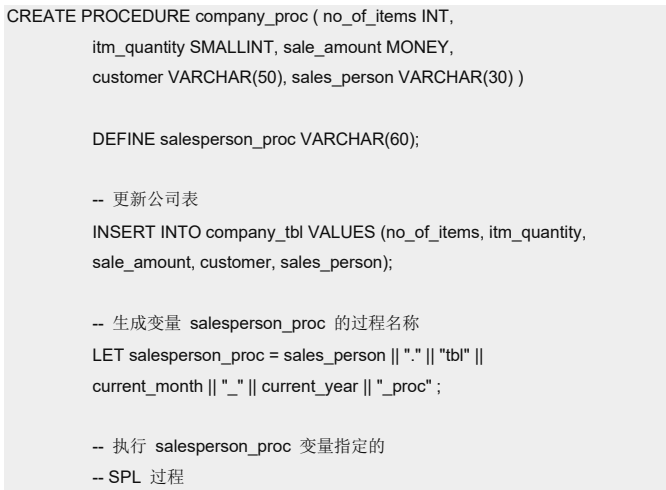 语句使用不同的值和连接运算符 || 来产生要执行的另一 SPL 过程的名称。在 LET 语句