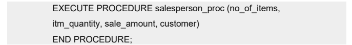 在示例中,过程 company_proc 接受五个参数,并将它们插入至 company_tbl 内。然后,LET
