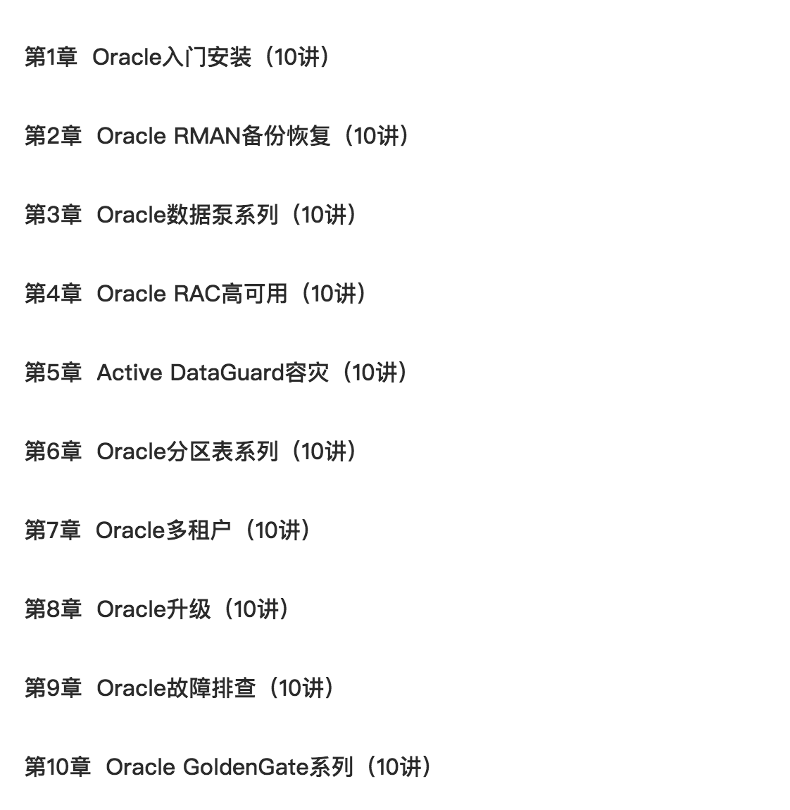 可以看到,课程涵盖面非常广泛,包括RMAN备份恢复,RAC高可用,DataGuard容灾,Oracle分区表系列,Oracle多租户,升级,故障排查和GoldenGate等十大章节,大家也不用担心学到“皮毛”。