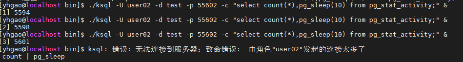 ./ksql -U user02 -d test -p 55602 -c "select count(*),pg_sleep(10) from pg_stat_activity;" &