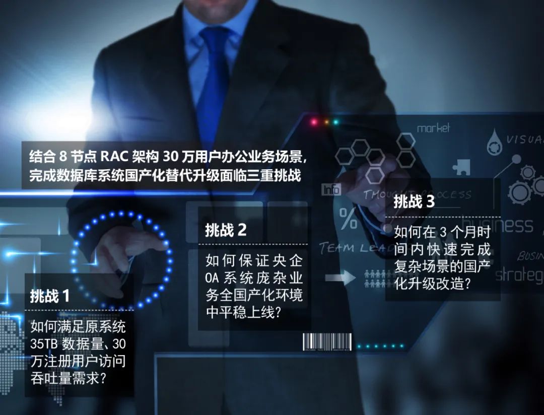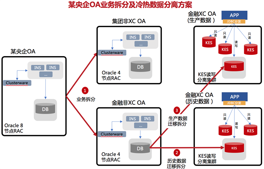 业务按部门进行拆分,由原来的央企OA拆分为集团OA和金融OA,逐步进行国产化替换,第一期金融OA替换,其数据量由原来央企OA系统的总数据量35TB分解成约18TB大小;