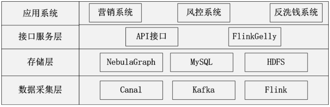 其中,数据通过 Canal、Kafka、Flink 等组件处理后,进入存储层。存储层由多种存储引擎组成,核心组件是 Nebula Graph。对外提供的服务方式,有 API 接口和图计算框架 Flink Gelly,分别应用于实时交互和图计算场景。整个平台,可以服务于多种业务:营销、风控、反洗钱等。目前,我们主要应用于时效要求不高的离线场景。
