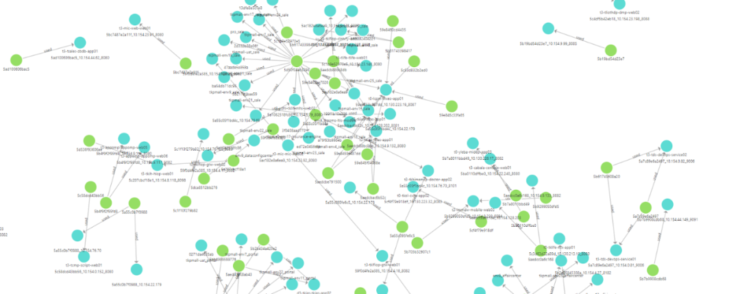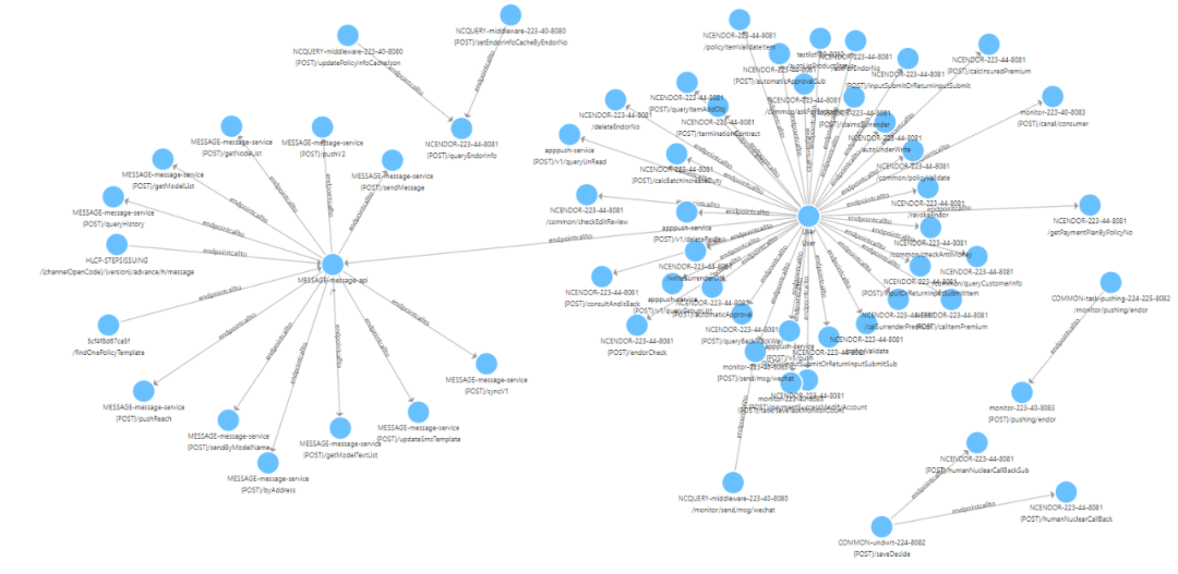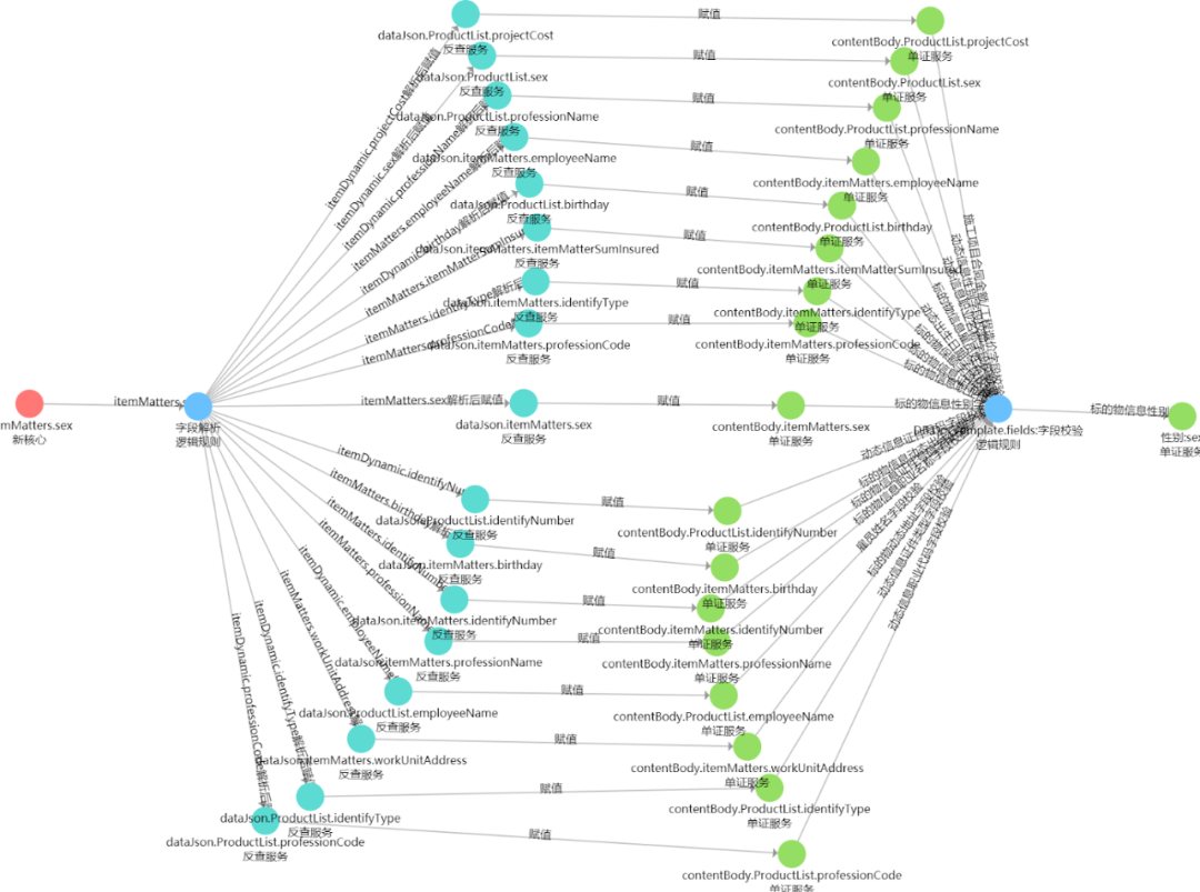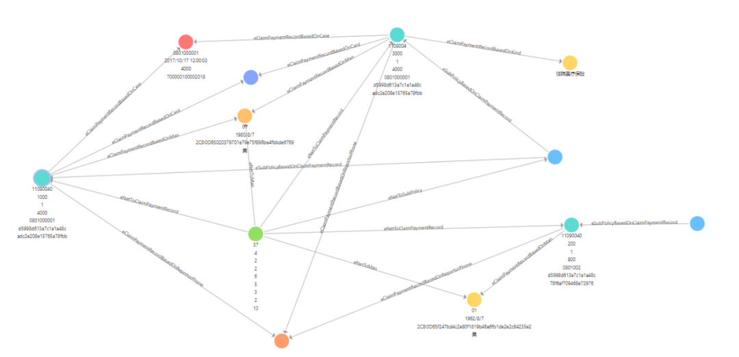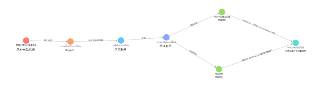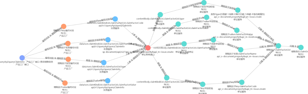 这是我们在系统间的数据血缘关系方面的应用。图示的是电子保单的数据流转链路、产品工厂和核心系统跟电子保单之间的数据关联关系。因为电子保单的数据,来自多个系统,调用关系复杂。通过图谱来展示这些关联关系,我们很方便地定位电子保单错误信息的数据来源,提高开发人员的联调效率。
