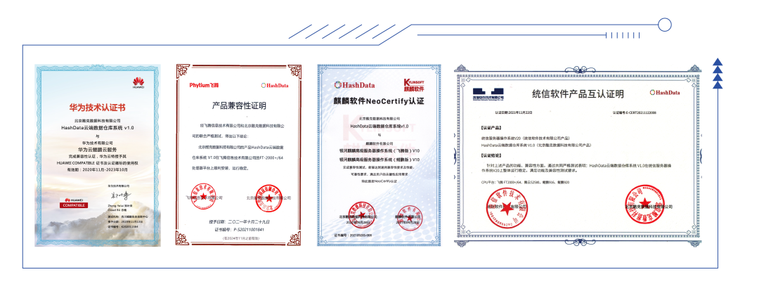 作为国内领先的数据库研发企业,早在2020年底,HashData便启动参与信创工作。当年,HashData与华为云鲲鹏云实现了兼容性认证。此后,随着客户在信创环境下的产品需求逐渐增多,HashData陆续完成了麒麟操作系统认证(鲲鹏版+飞腾版)、飞腾芯片兼容性认证、统信操作系统认证(飞腾、腾云、鲲鹏916、鲲鹏920)。