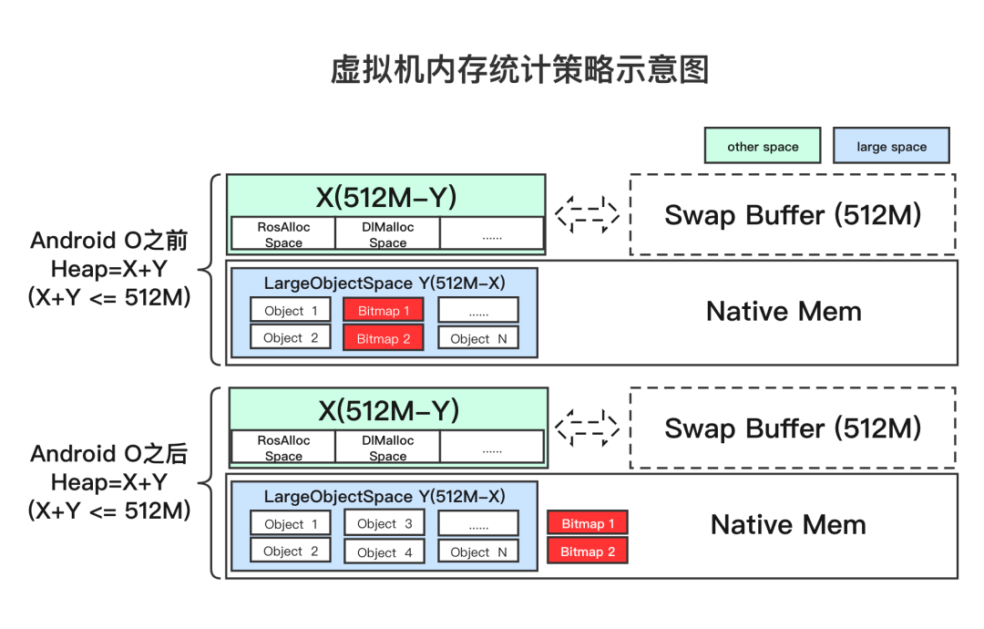 | Android O 以下 | 512M | 512M | 1.所有内存空间共享虚拟机 512M 内存 2.Bitmap 源数据纳入 Java 内存统计 3.LargeObjectSpace 与其它内存空间共享 |