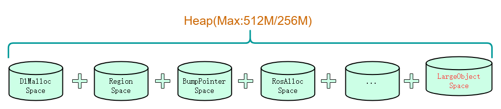 众所周知,系统在创建 Zygote 过程中会初始化虚拟机配置,其中一个便是设置 Heap 内存。默认 HeapMax 是 256M、512M,后续应用进程通过 Zygote 进程孵化时,都会继承该配置且无法修改。但对于虚拟机来说,为了更好地管理内存并提升分配和回收性能,并没有将所有 Java 对象全部放在一块空间进行管理,而是按照不同的场景属性划分成若干个内存空间,这些内存空间将会共享虚拟机 512M 最大内存,因此它们之间是一个此消彼长的关系,如下图: