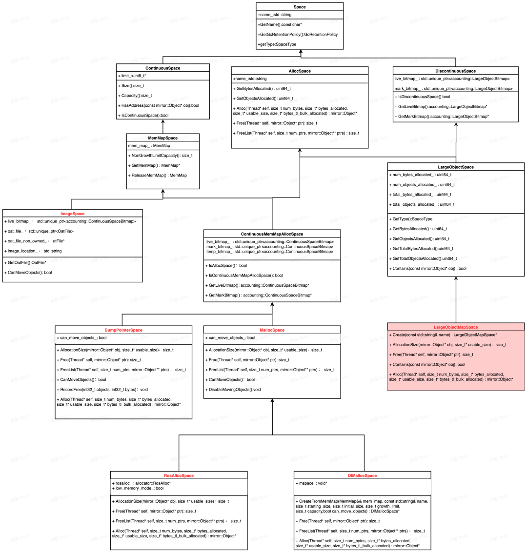 同时虚拟机在 GC 过程中,可以将部分 Object 对象进行移动以降低内存碎片,因此根据内存对象是否支持移动分为可移动对象、不可移动对象;按照连续性分为连续性空间(ContinuousMemMapAllocSpace)和非连续空间(DiscontinuousSpace);最终每个子类的 Space 都继承至 Space 和 ContinuousSpace/DisContinuousSpace,从上而下的继承关系,如下图: