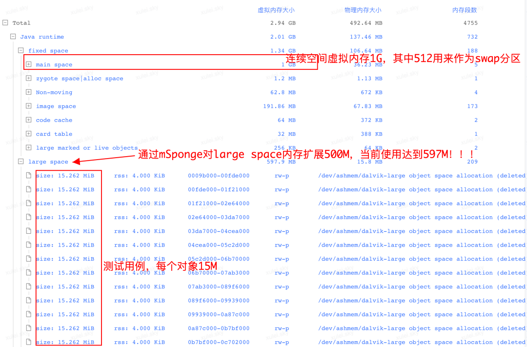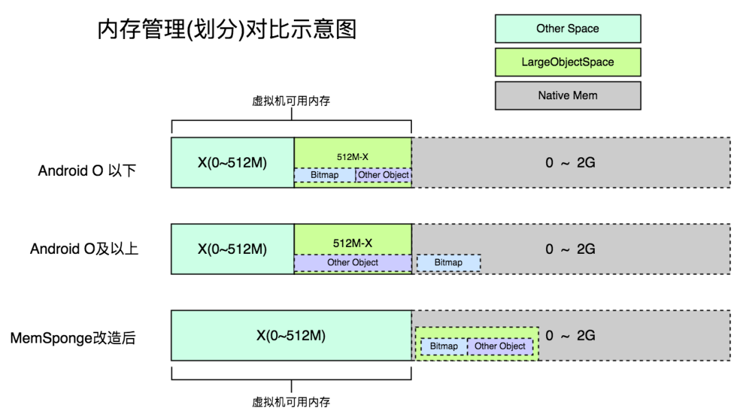 | mSponge 改造方案 | 512M | 32 位:2G/3G | 1.除 LargeObjectSpace 之外,其它内存空间共享 512M 内存 2.LargeObjectSpace 整体内存不再纳入 Java 内存统计 |