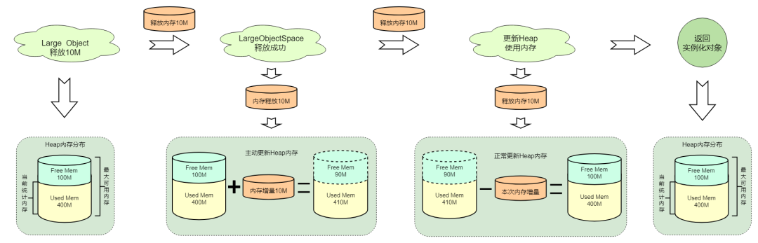 如果后续 GC 过程中释放了 LargeObjectSpace 中的部分或者全部对象,正常情况下释放的内存会同步同步到 Heap,以便于更新整体使用内存及可用内存,但是从上面的分析中我们知道,其实 LargeObjectSpace 的内存已经不在 Heap 统计之中了,如果从 Heap 中减去释放的这些内存,那么将会导致 Heap 统计的内存偏少,因此需要主动将该部分释放的内存"补偿"回来,避免统计错乱。