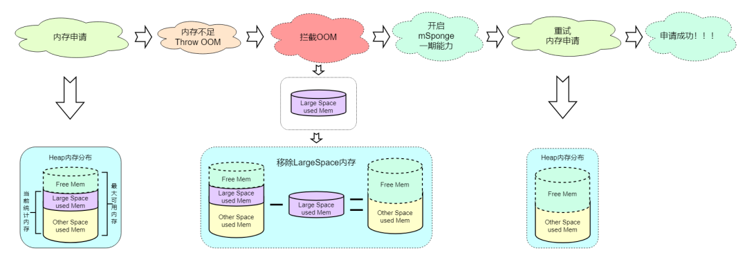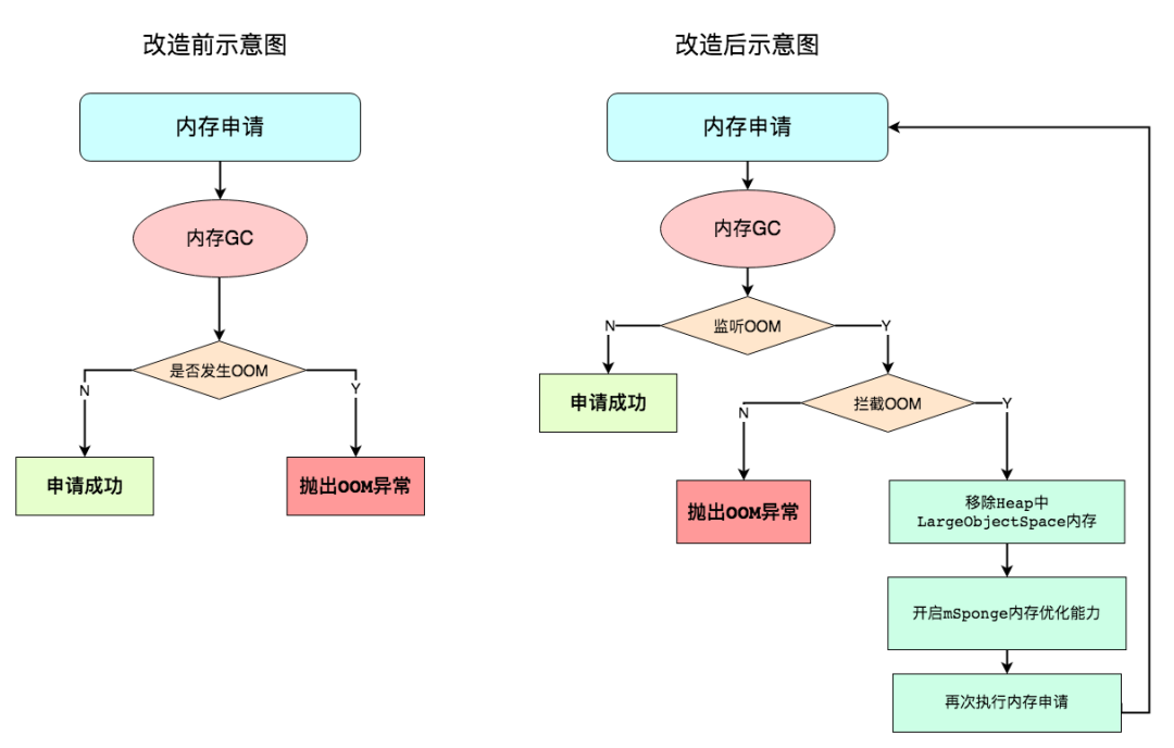 针对上述思考,基于 mSponge 方案一期的设计,决定采用“OOM 探测+按需开启”的策略来完成对内存的按需扩展。即:对内存申请过程进行定向监控,当监听到内存不足即将抛出 OOM 异常时,进行拦截,并激活 mSponge 方案一期内存优化方案(从 Heap 内存统计中移除当前 LargeObjectSpace 使用内存);然后再触发一次内存申请,以保证内存成功申请。按照上述思路,整理方案优化前后对比示意图: