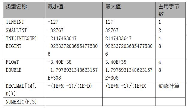 整数类型。 INTEGER 的同义词。它的范围是-2147483647 到 2147483647,INT 占用 4 个字节。