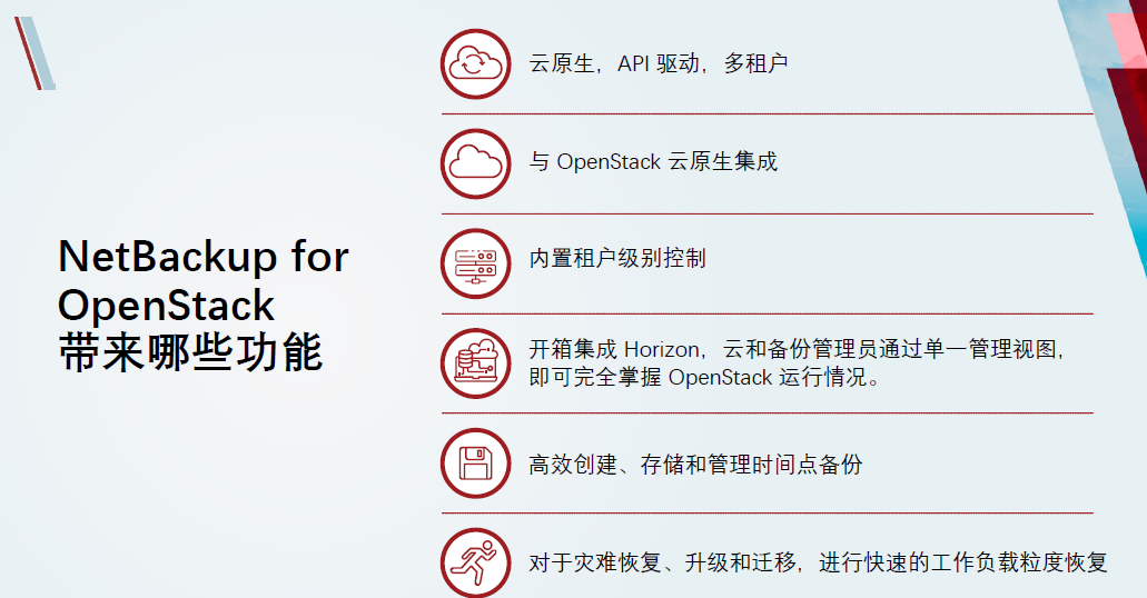 NBU for OpenStack主要在OpenStack的时间点做快照,并提供完整的OpenStack配置数据整合能力。因此租户可用极为简单的方式将工作负载无缝地还原到原始状态。
