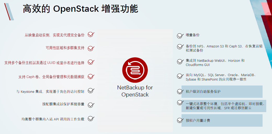 NBU for OpenStack是Veritas NBU数据管理解决方案的一个核心,可以帮助组织改善OpenStack环境的RPO与RTO,它提供了工作负载、虚拟机、单一的文件或者目录点对点的恢复,是备份管理员、开发与测试人员可以轻松使用的高效工具。