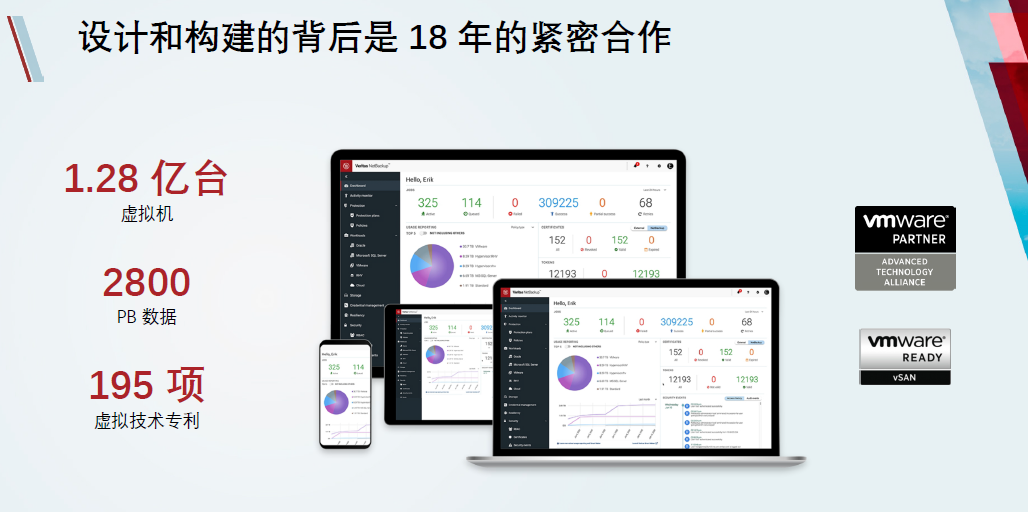 Veritas与VMware已经合作了将近18年,过去三十年来Veritas一直是备份的黄金标准,也帮助全球的企业保护了1.28亿台虚拟机,2800PB的数据。Veritas同时不断创新,在全球拥有195项虚拟化数据保护专利。