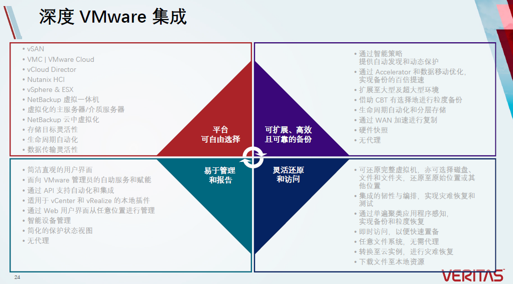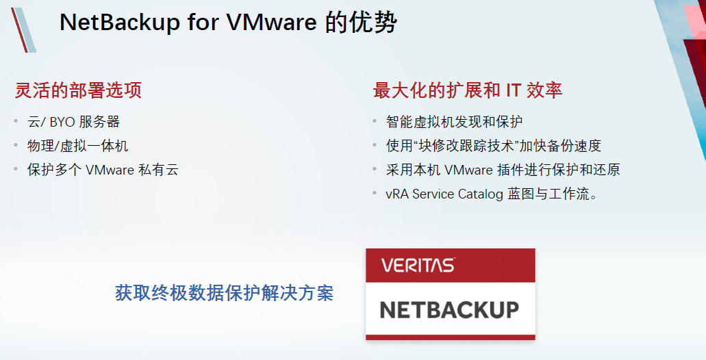 之所以企业会采用NBU来保护VMware虚拟平台,是因为NBU与VMware的深度整合。在NBU架构中,无论用户是用什么样的VMware平台,可以选择HCI,一般的物理机,也可以选择vSAN的架构,NBU均能实现完整的保护。并且通过VMware的智能策略,提供更灵活的备份策略。
