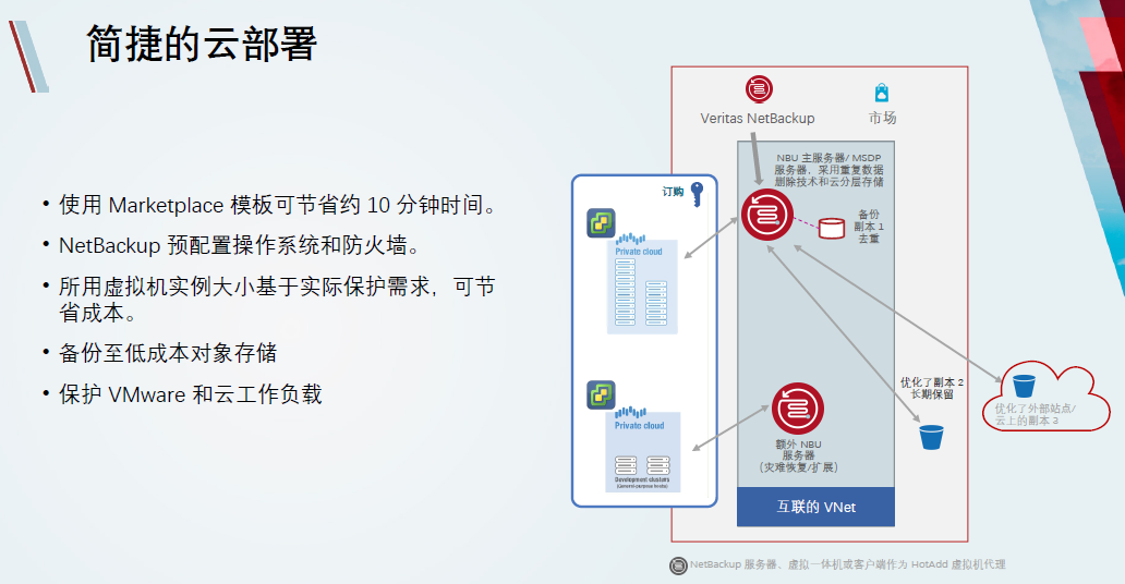 NBU 8.3之后,用户可以在多个公有云的市场中直接使用NBU模板,建立云上的NBU环境,并通过云供应商存储的等级分类建立一个长期的数据存储解决方案。除了云中的备份,NBU更可以将本地的虚拟机备份复制到云中,可以是公有云、私有云。通过重复数据删除技术,将复制的副本放置在公有云中,甚至其他外部的云平台。利用镜像共享(Image Share)技术可以立即将备份数据在云中恢复,或挂载起来运行。