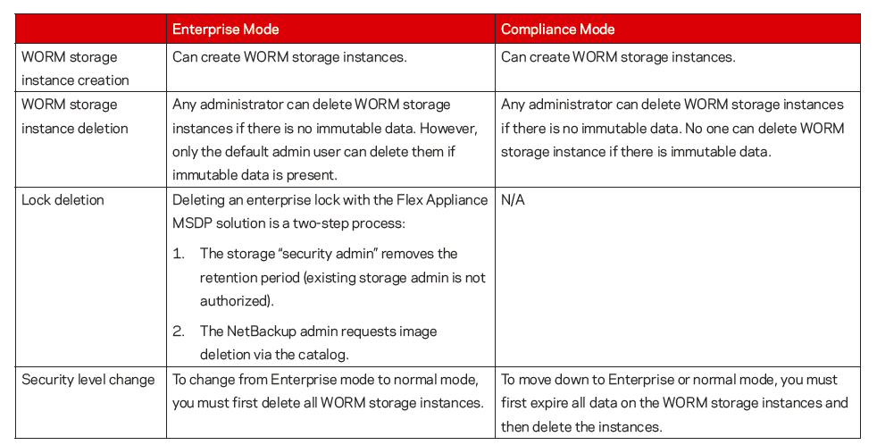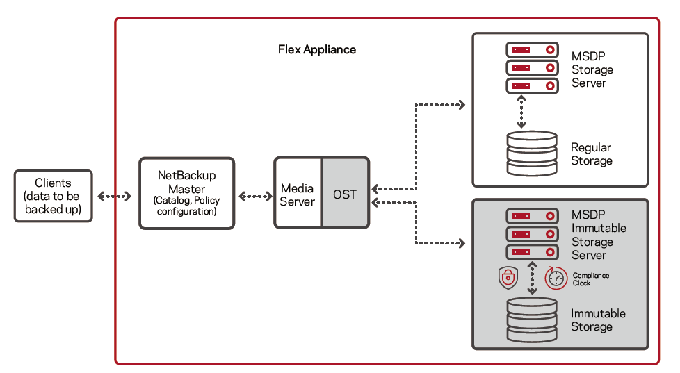 NetBackup 8.3主服务器与存储单元通信,集成了防篡改和擦除能力,并可设置WORM保留期限(最小/最大)。然后,主服务器在存储单元上设置防篡改控制,并应用WORM保留期限策略。NetBackup软件可提供带有防篡改锁可视化展现的备份映像管理功能,WORM保留期满后的映像删除(通过CLI),并尊重对目录的合法持有。Flex一体机运行防篡改存储服务器来提供WORM功能、保留锁以及针对勒索软件和恶意软件威胁的平台加固。合规时钟(Compliance Clock)用于保留期限,并且是独立于操作系统时间的。Flex一体机有两种锁定防篡改模式——企业模式和合规模式。设备锁定状态可以在任何时候启用。用户可以选择合规模式或企业模式的MSDP存储容器,但不能混合使用。