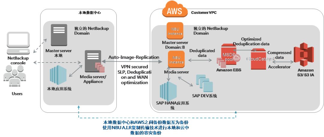 云端数据管理方面,通过NetBackup,跨本地和云,集中管理整体数据备份环境,实现本地数据中心和AWS之间备份数据互为备份。平台遵循SAP最佳实践,将云中核心数据使用NBU Auto Image Replication(A.I.R)复制一份到本地数据中心做保存。同时,将SAP HANA应用系统数据备份到由EBS存储构建的MSDP重删池中,保留2-3份数据,更久的数据副本则通过NetBackup CloudCatalyst以重删格式存储到Amazon S3对象存储中,设置相应的数据保留期限。此外,在本地数据中心配置NetBackup一体机,用以存放云中SAP容灾数据,增强数据安全性和访问效率。