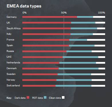 ►预计到2020年,接受调查的组织将花费天价的费用来解决ROT数据的膨胀。在最全面的同类型研究中,我们发现EMEA组织平均持有54%的暗数据,32%的ROT数据和14%的可辩别的关键业务数据。如果不经处理、任其发展,到2020年这些数据就会不可避免地成为一笔高昂的存储和管理成本。