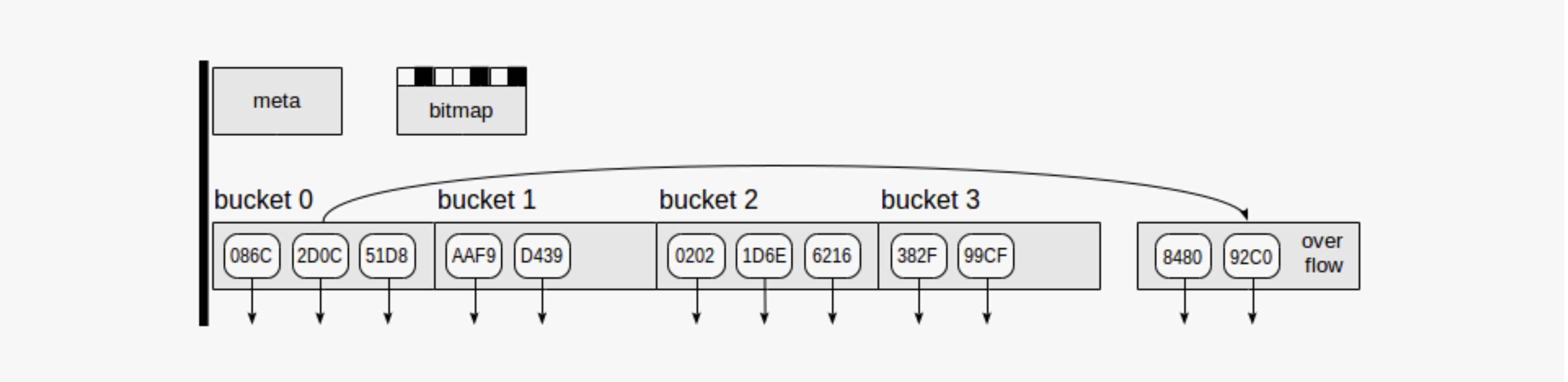 其中 hashm_spares[0] = 0,因此 bucket 0 和 bucket 1 的 bucket page 的 block number 分别是 1 和 2。