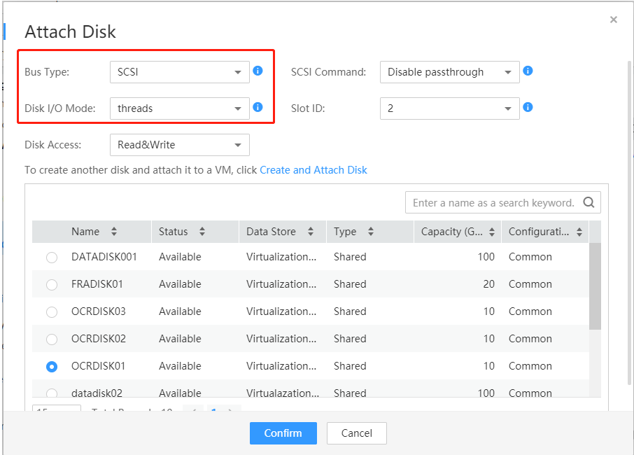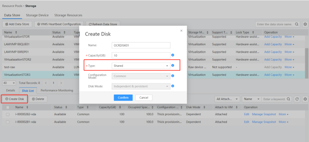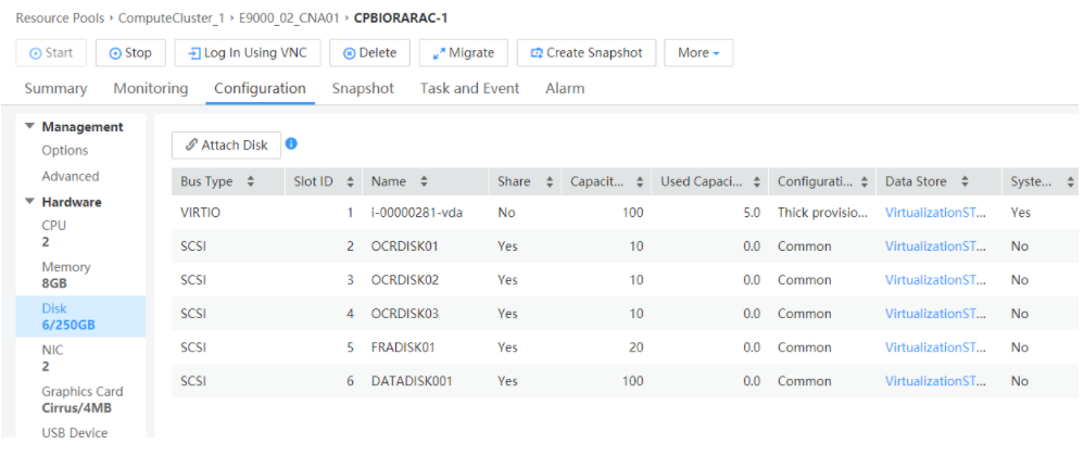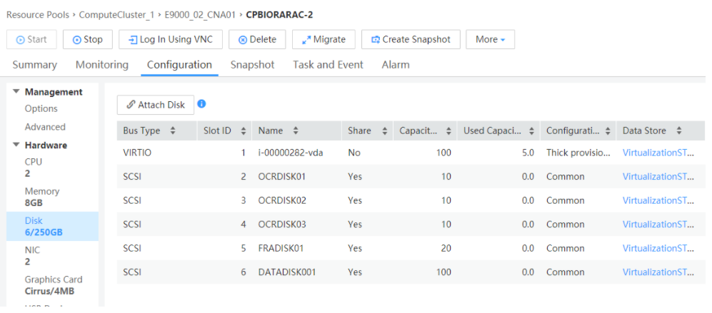 | 2 | /dev/sdb | 20G | VirtualizationSTOR3 | fc_OCR_002 | OCRDISK02 | OCR | |